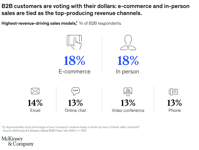 Before diving into the key benefits of a B2B eCommerce platform - let's address a common misconception that most companies don't offer buying through an online store. Wrong! According to McKinsey & Company, 65% of B2B companies now offer e-commerce capabilities. And on top of that, eCommerce and in-person sales are tied as the top-producing revenue channels.